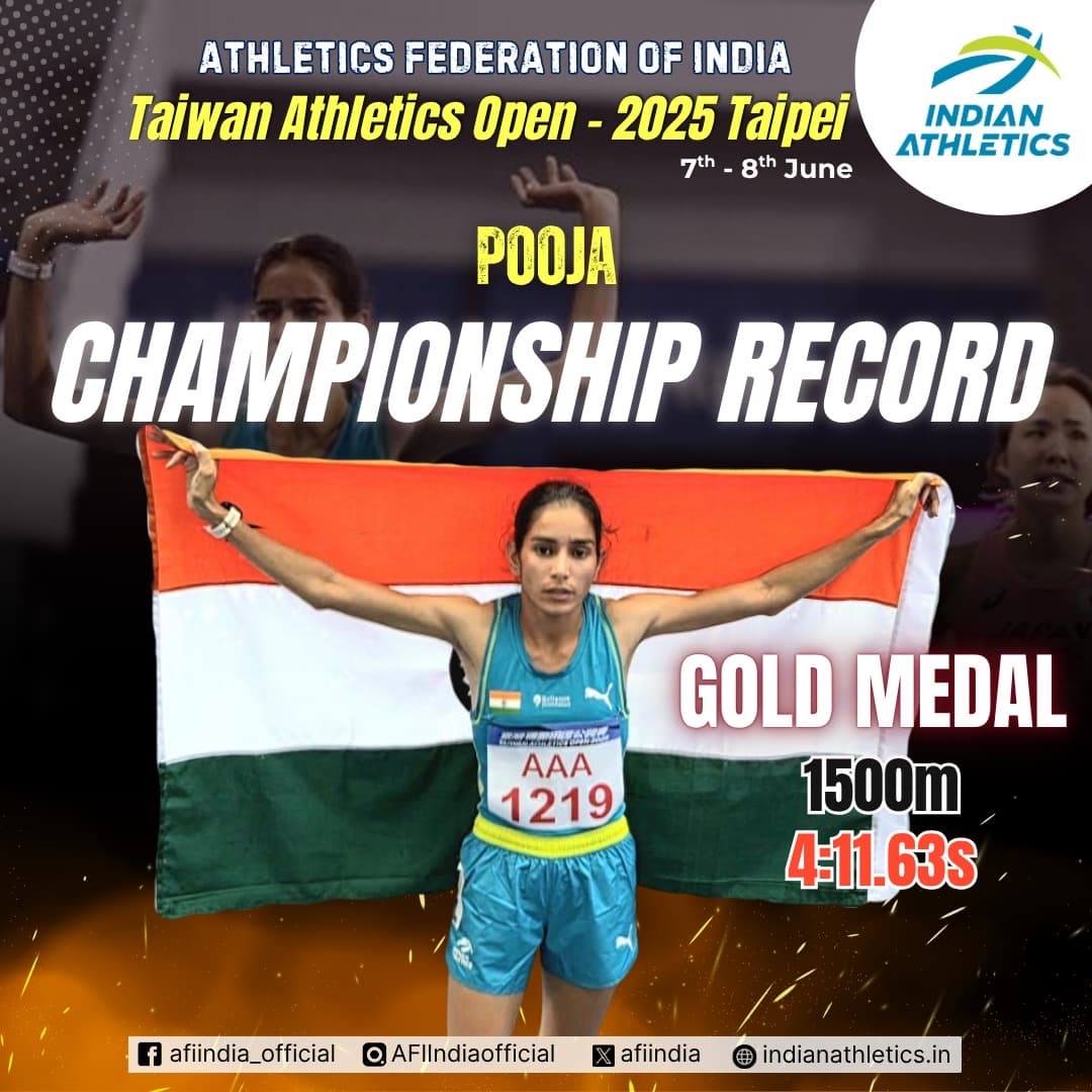 बिलासपुर । दक्षिण पूर्व मध्य रेलवे की उत्कृष्ट एथलीट एवं बिलासपुर रेल मंडल में टिकट कलेक्टर सह वाणिज्य लिपिक के पद पर कार्यरत महिला खिलाड़ी पूजा ने एक बार फिर भारतीय रेलवे एवं दक्षिण पूर्व मध्य रेलवे के साथ देश का नाम रोशन करते हुए ताइवान ओपन एथलेटिक्स मीट 2025 में महिलाओं की 1500 मीटर एवं 800 मीटर दौड़ में शानदार प्रदर्शन कर 2 स्वर्ण पदक अपने नाम किया है।