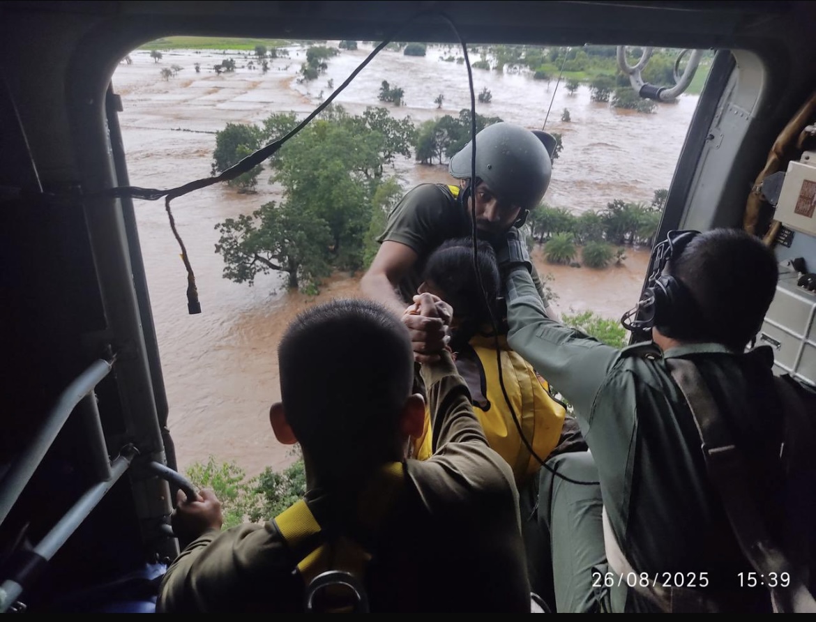 अनुकूल मौसम न होने के बावजूद, वायुसेना का Mi-17 V5 हेलीकॉप्टर जगदलपुर एयरफील्ड से रवाना किया गया। गहन हवाई तलाशी के बाद ग्रामीणों को छत पर फँसा पाया गया, जो तेज बहाव और ऊँचे पेड़ों से घिरे हुए थे। स्थल पर उतरना असंभव होने पर वायुसेना के गरुड़ कमांडो को नीचे उतारा गया, जिसने एक-एक कर सभी ग्रामीणों को सुरक्षित हेलीकॉप्टर तक पहुँचाया।