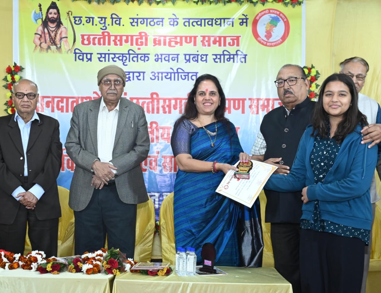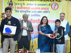 पुरस्कार वितरण समारोह में विजेताओं को पुरस्कृत करते हुए महापौर मीनल चौबे ने कहा कि छत्तीसगढ़ी ब्राह्मण समाज द्वारा आयोजित सांस्कृतिक कार्यक्रम निश्चित ही हमारे बच्चों के सर्वांगीण विकास में सहायक होंगे। इस प्रकार का आयोजन निरंतर होते रहना चाहिए। जिससे छत्तीसगढ़ी ब्राह्मण समाज संगठित हो सके और हम सब एक दूसरे की सहायता से आगे बढ़ते रहें। प्रोफेसर एसके पांडेय ने अपने संबोधन में कहा कि ब्राह्मण का पहला धर्म विद्यादान है। विद्यादान महादान है, और इसी कड़ी में विप्र महाविद्यालय एवं विप्र पब्लिक स्कूल सर्व सुविधा युक्त संपन्न होने के साथ न्यूनतम शुल्क में गुणवत्तापूर्ण शिक्षा देने के लिए तत्पर है ।इसके साथ छत्तीसगढ़ी ब्राह्मण समाज द्वारा पूरे वर्ष भर विभिन्न कार्यक्रमों के माध्यम से समाज को जोड़ने का कार्य कर रहा है। आज हमें युवा वर्ग को जोड़ने की आवश्यकता है। युवाओं पर आधारित और युवाओं की आवश्यकताओं पर केंद्रित कार्यक्रमों की श्रृंखला छत्तीसगढ़ी ब्राह्मण समाज को करना होगा ।ताकि आज के प्रतिस्पर्धा के युग में हमारे समाज के युवा किसी से पीछे ना रहे। इस अवसर पर छत्तीसगढ़ युवा विकास संगठन के अध्यक्ष ज्ञानेश शर्मा ने एक केंद्रीय छत्तीसगढ़ी ब्राह्मण समाज के गठन की आवश्यकता पर जोर दिया। उन्होंने कहा कि आज छत्तीसगढ़ी ब्राह्मण समाज का एक मजबूत संगठन की आवश्यकता है। जिसके अंतर्गत समस्त ब्राह्मण समाज की संस्थाएं उनके मार्गदर्शन में काम करें। और समाज एक निश्चित विकास की दिशा में आगे बढ़े। इस अवसर पर एम.डी .दीवान ने ₹51,000 के दान की घोषणा की, जिसका उपयोग बाल समाज लाइब्रेरी के विकास में किया जाएगा। बाल मंदिर में पढ़ी रश्मि विनय शुक्ला ने बाल समाज लाइब्रेरी के विकास के लिए ₹1,01000 दान की घोषणा की। उन्होंने बताया कि उनकी प्रारंभिक शिक्षा वहीं से हुई अतः भवन के नवनिर्माण में योगदान देकर उन्हें खुशी होगी। पूर्णिमा शेखर दुबे ने भी विप्र भवन द्वारा छत्तीसगढ़ी ब्राह्मण समाज के विद्यार्थियों को छात्रवृत्ति प्रदान करने के लिए 51,000/ – एवं बाल समाज लाइब्रेरी के नवनिर्माण के लिए 51,000/ – रुपए दान की घोषणा की। इसके पूर्व विप्र सांस्कृतिक भवन प्रबंध समिति के अध्यक्ष नरेंद्र तिवारी ने अपने स्वागत भाषण में समस्त अतिथियों का स्वागत करते हुए कहा कि विप्र भवन छत्तीसगढ़ी ब्राह्मण समाज के गतिविधियों और कार्यक्रमों का केंद्र बना हुआ है। इसलिए समाज के समस्त सदस्य यहां के हर कार्यक्रम में उपस्थित होकर इसका लाभ ले एवं अपना सुझाव प्रेषित करें। इस अवसर पर महासचिव नटराज शर्मा ने वार्षिक प्रतिवेदन प्रस्तुत करते हुए वर्ष भर की गतिविधियों का विवरण प्रस्तुत किया ।इसके उपरांत विप्र शक्ति महिला मंडल के अ